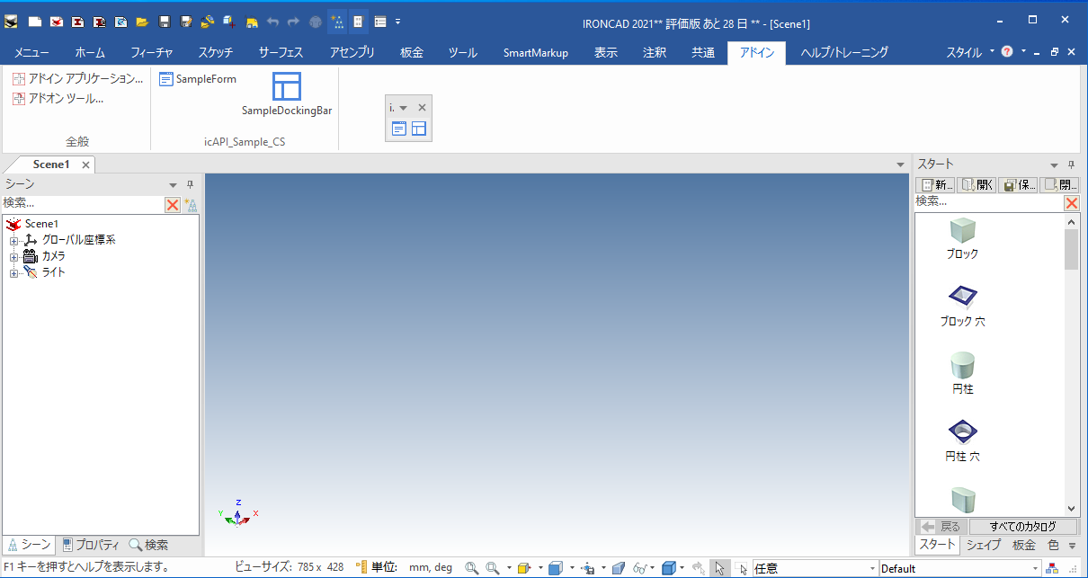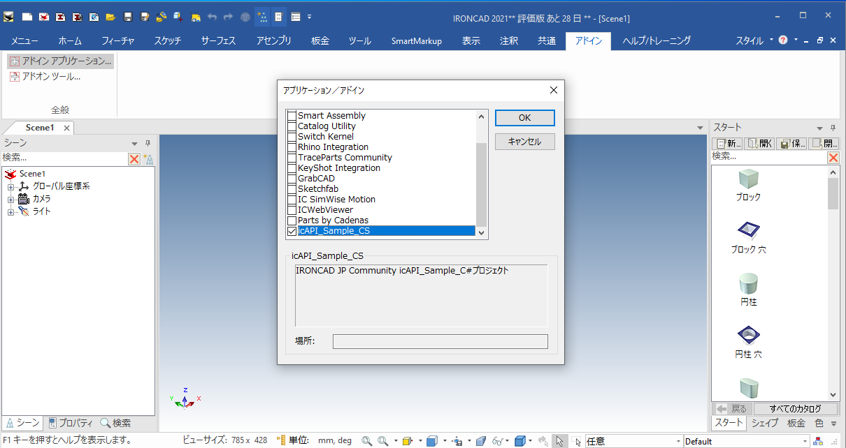 IRONCADを起動し、タブ: [アドイン] – [アドインアプリケーション]を開きます。