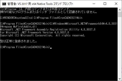 RegAsm : error RA0000 : ‘C:\Program Files\IronCAD\2021\bin\MyFirstAddin.dll’ は有効な .NET アセンブリではないため、読み込めませんでした。