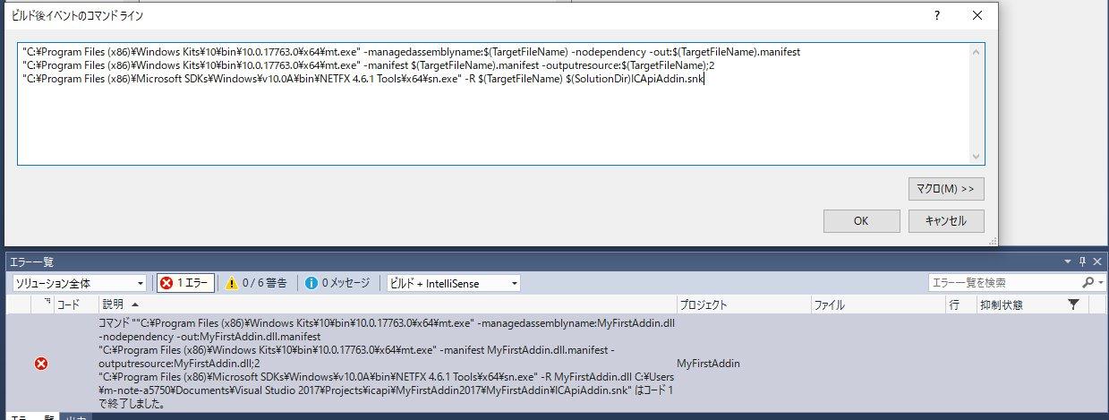 エラー コマンド “”C:\Program Files (x86)\Windows Kits\8.1\bin\x86\mt.exe” -manifest C:\Users\m-note-a5750\source\repos\ICAPI\Samples\C#\MyFirstAddin\MyFirstAddin.dll.manifest -outputresource:MyFirstAddin.dll;2