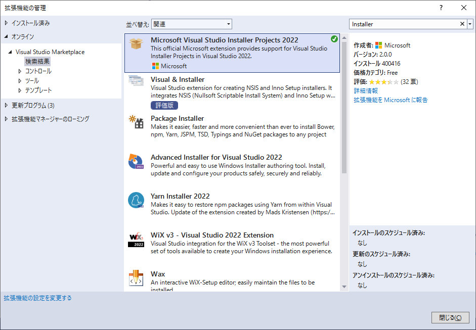 VisualStudioのメニュー [拡張機能] – [拡張機能の管理]からオンラインを開き、Installerと検索窓に打ち込むと