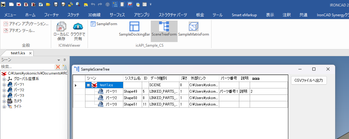 最初は取っ付き難いと思いますので、公開しているC#のサンプルプログラムに パーツ名やカスタムプロパティの値を取得する機能を追加しました。 CSVでの出力機能も追加しています。