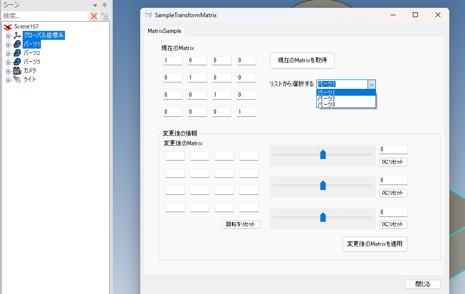 呼び出しのサンプルはbuttonGetCurrentMatrix_Clickに記載しています。
